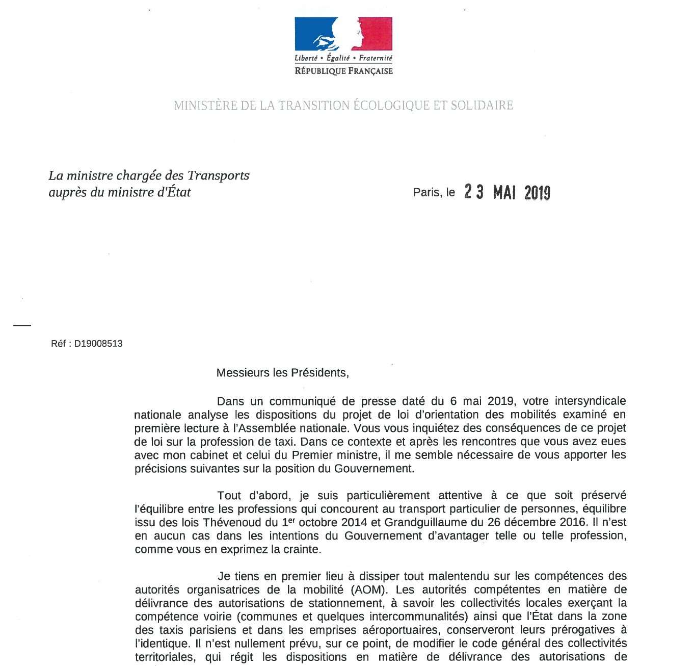Courrier du 23 Mai de Madame Borne, Ministre chargée du Transport auprès du Ministre d’Etat.