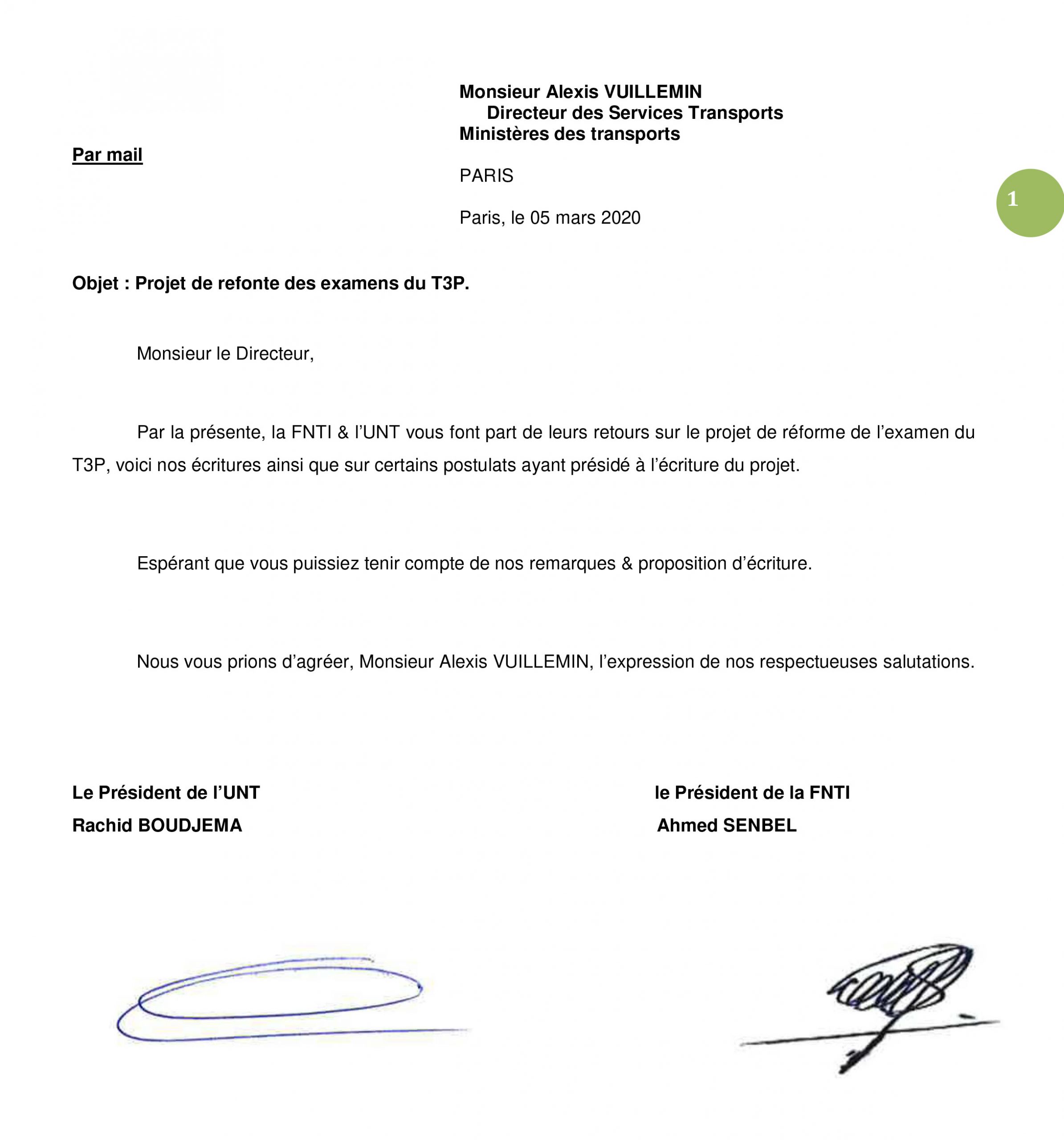 COURRIER FNTI UNT 05 MARS 2020 PROJET DE REFORME DES EXAMENS TAX