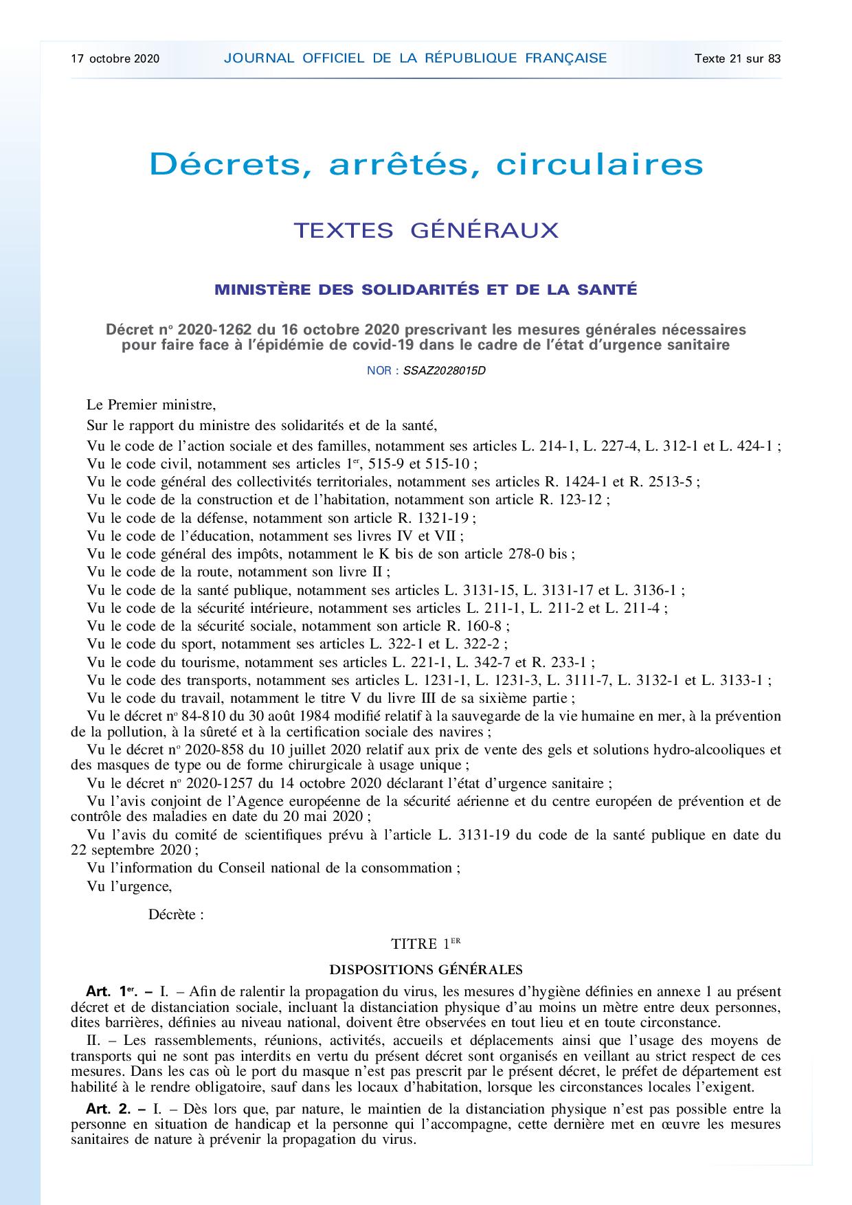 Vous trouverez ci-dessous le décret portant sur les nouvelles mesure sanitaires prise par le gouvernement. Il est à relevé deux point particulier, à savoir que les préfets peuvent prendre des mesures de restriction supplémentaires y compris dans les départements non soumis aux restrictions, que d autre part les mesures de de distanciation sociale, de protection sanitaires sont renforcé ce y compris pour les salariés.
